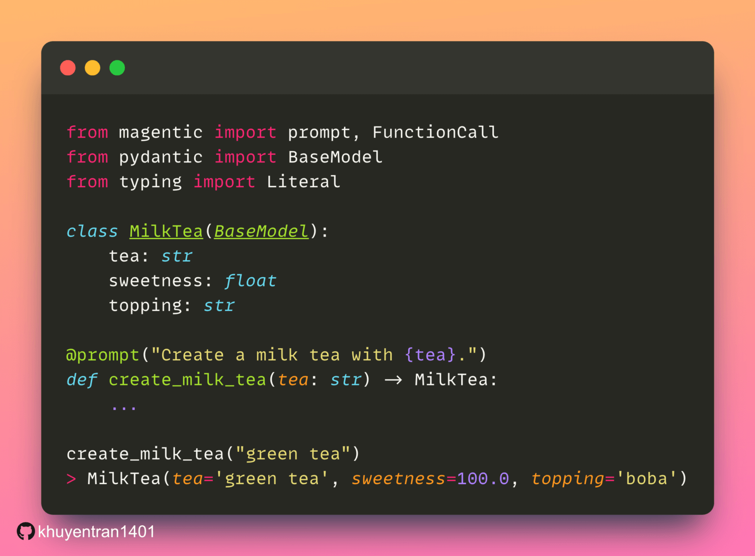 With magentic, you can use the @prompt decorator to create functions that return organized LLM results, keeping your code neat and easy to read.