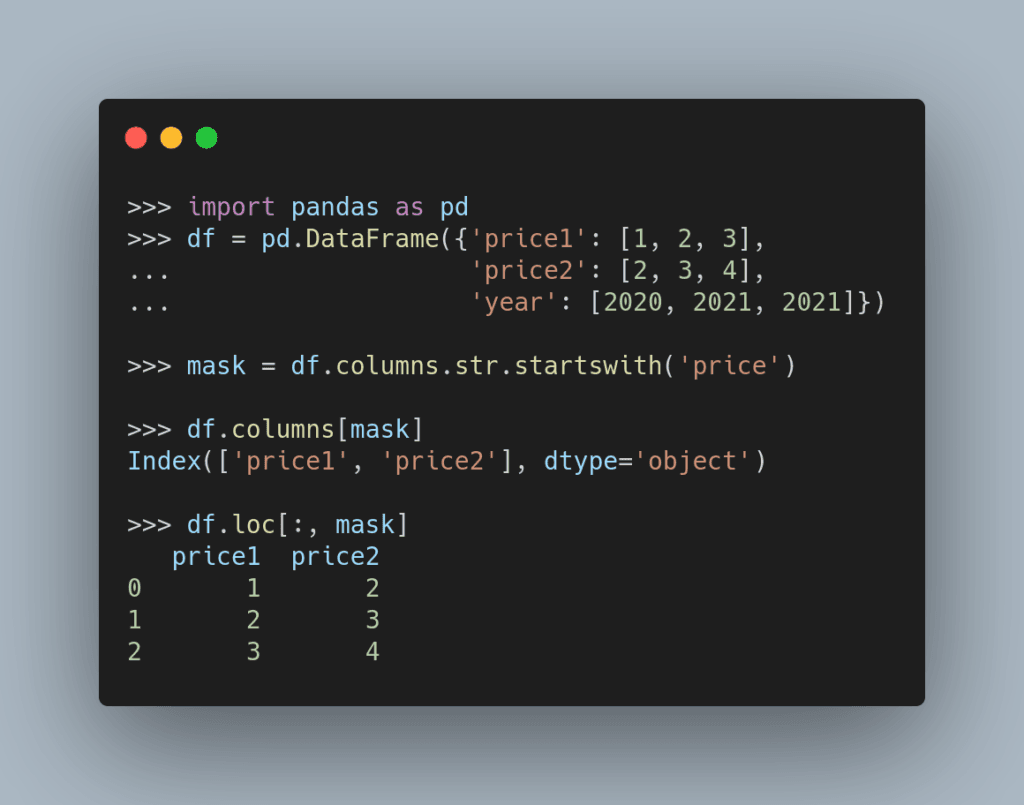 To find Pandas DataFrame whose columns start with a pattern, use df.columns.str.startswith. Find an example of this method in the image above.