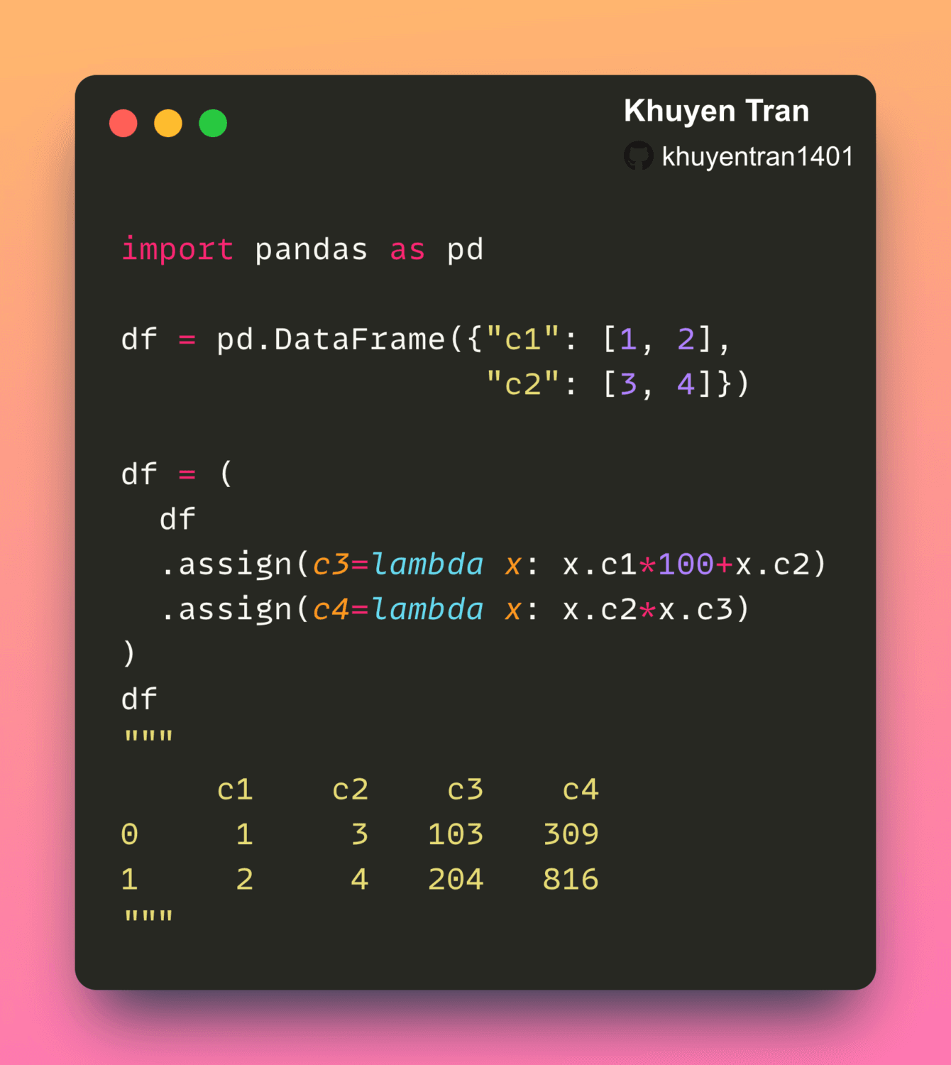df.assign allows you to assign values to multiple new columns in one line of code.