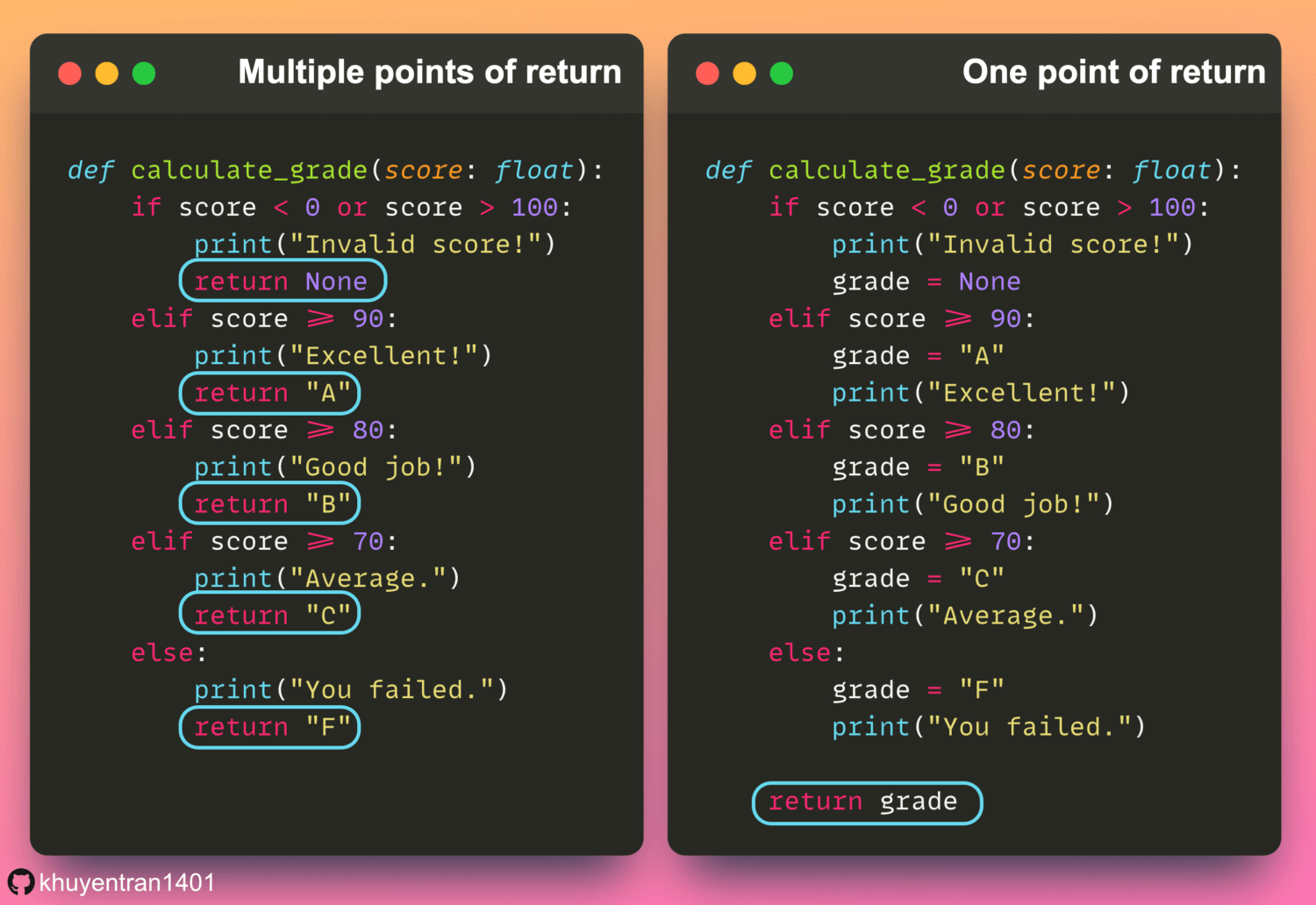 Consider using a single point of return in a Python function instead of multiple points of return to enhance code readability.