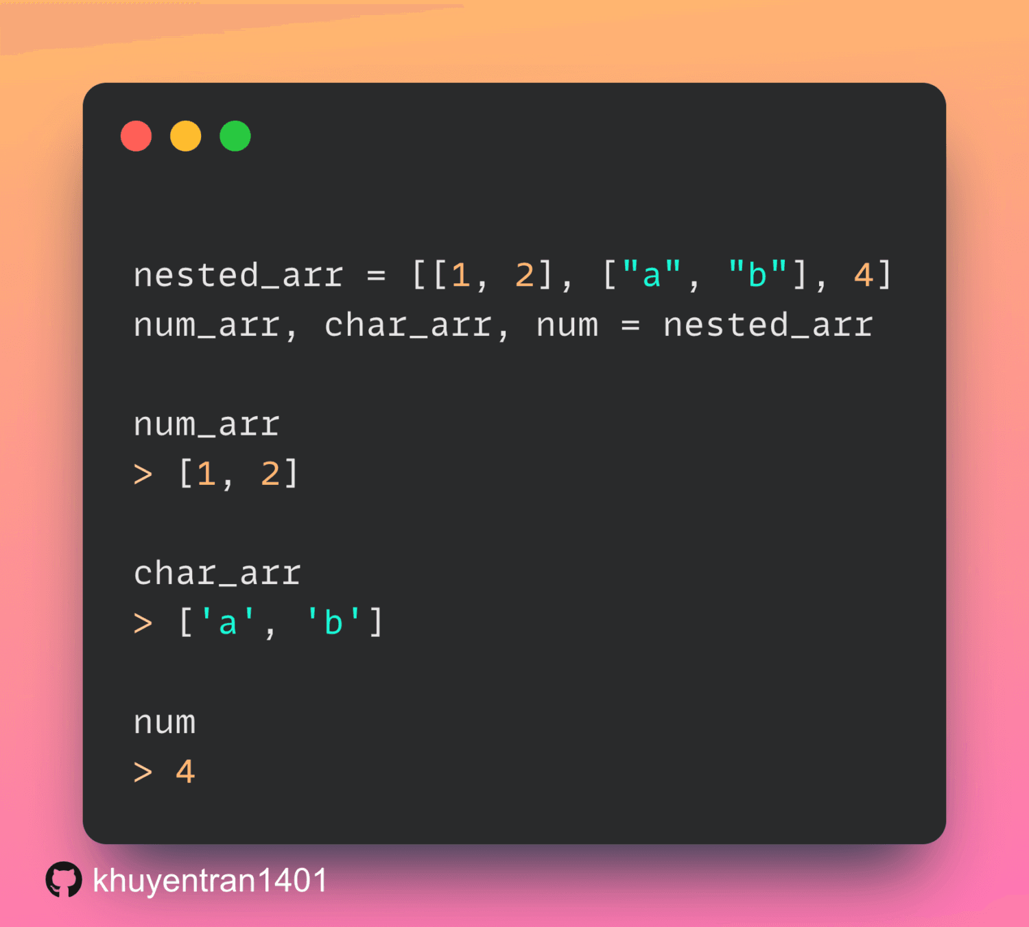 You can unpack a Python iterable (such as list, tuple, string) by assigning the items of that iterable to different variables.