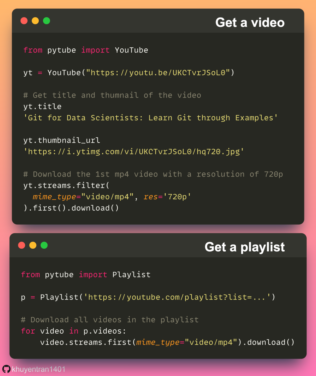 pytube is a lightweight Python library that enables you to download YouTube videos and playlists in specific formats and resolutions.